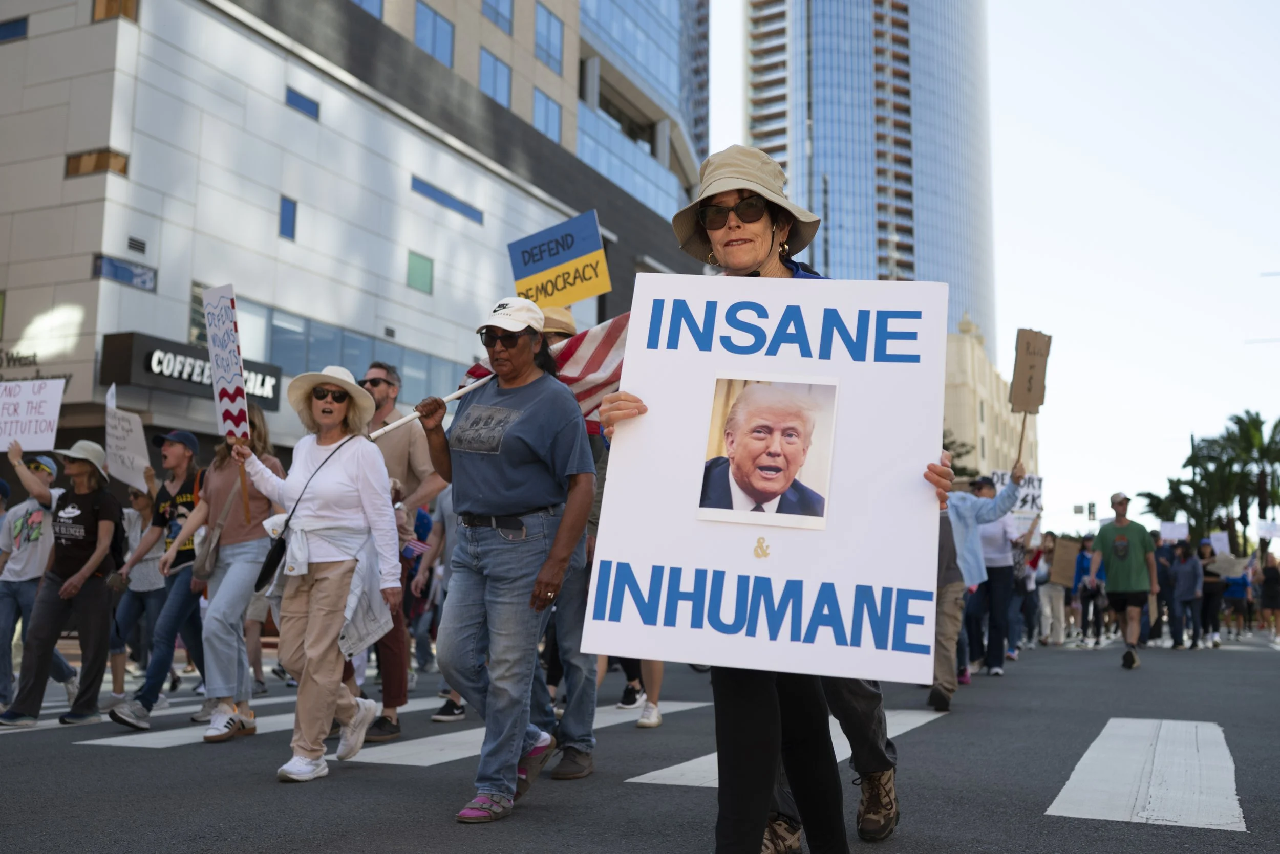 Demonstrators march through downtown San Diego carrying signs during a "Hands Off" protest calling for the protection of democratic institutions, Saturday, April 5, 2025.