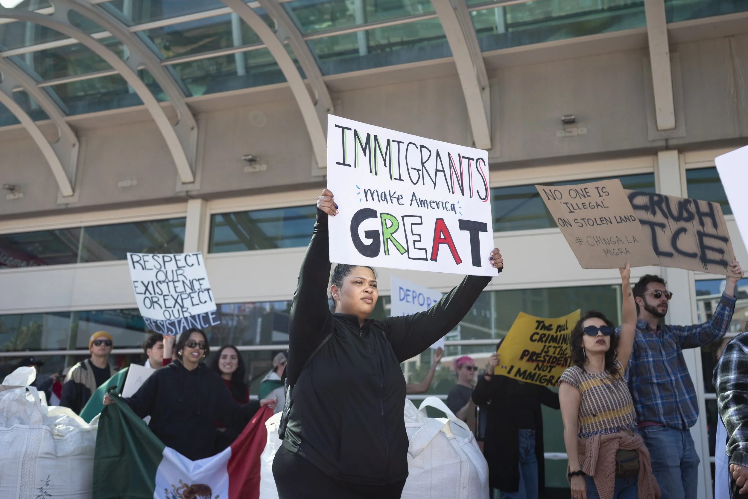 Demonstrators rally at the San Diego Convention Center in downtown San Diego during an immigration-rights protest, Sunday, February 2, 2025.